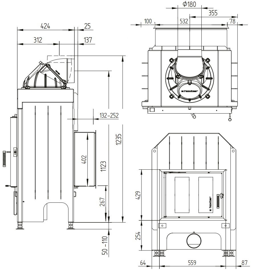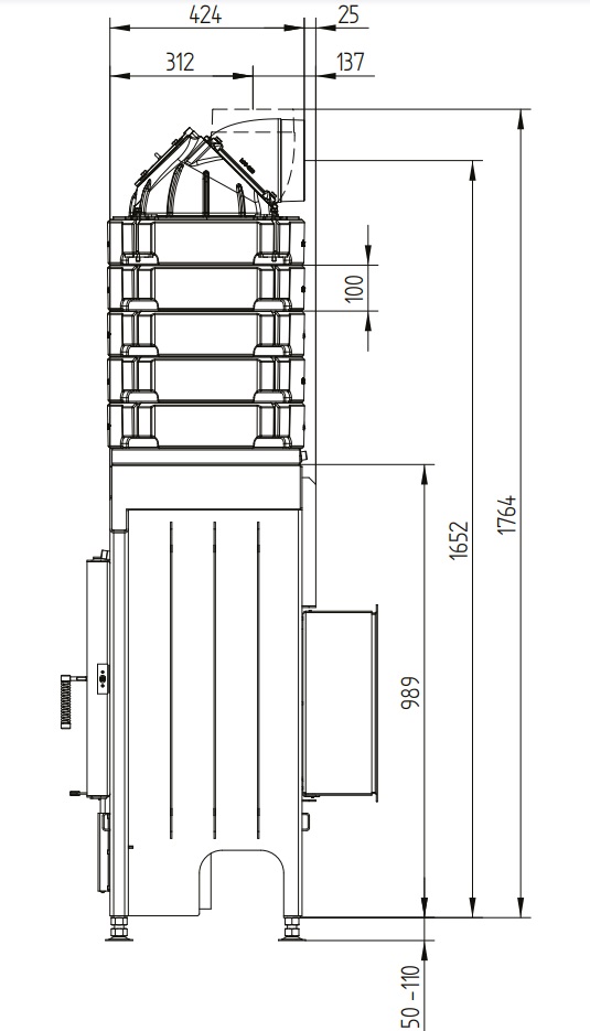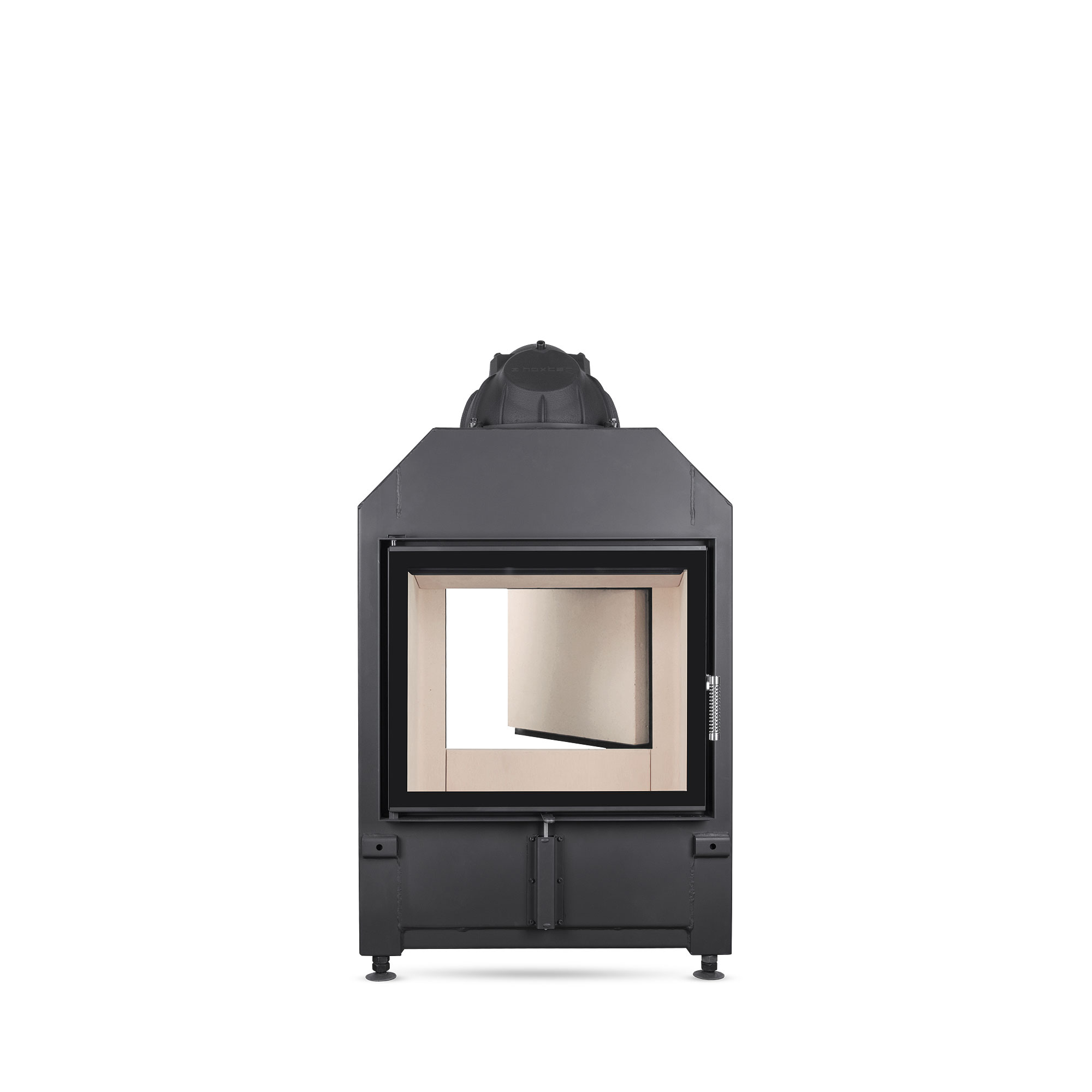 Horúce spaliny prúdia z ohniska cez pripojenú akumulačnú masu nasadenú na krbovej vložke alebo vedľa nej.